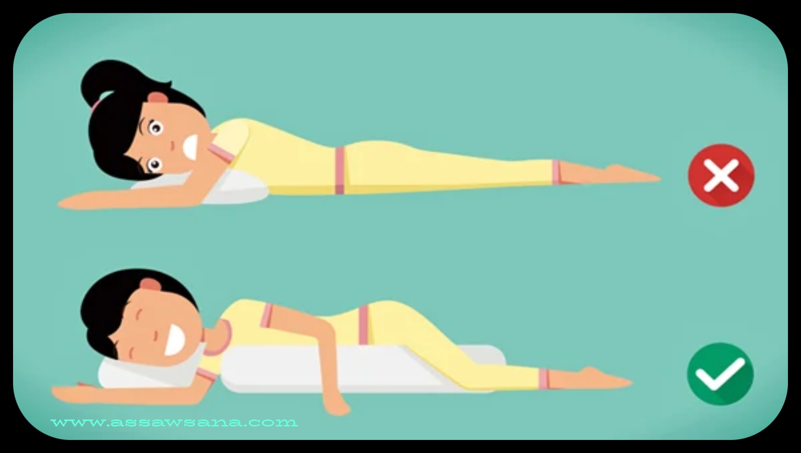 -إقناع النفس بالاستلقاء على الجانبين خاصة إذا كانت المرأة حامل، لأنّ فكرة نوم الحامل على بطنها من الأمور الخطيرة جداً حيث يضغط الجنين والوزن الزائد حول وسط الحامل على منطقتي العمود الفقري والرقبة.