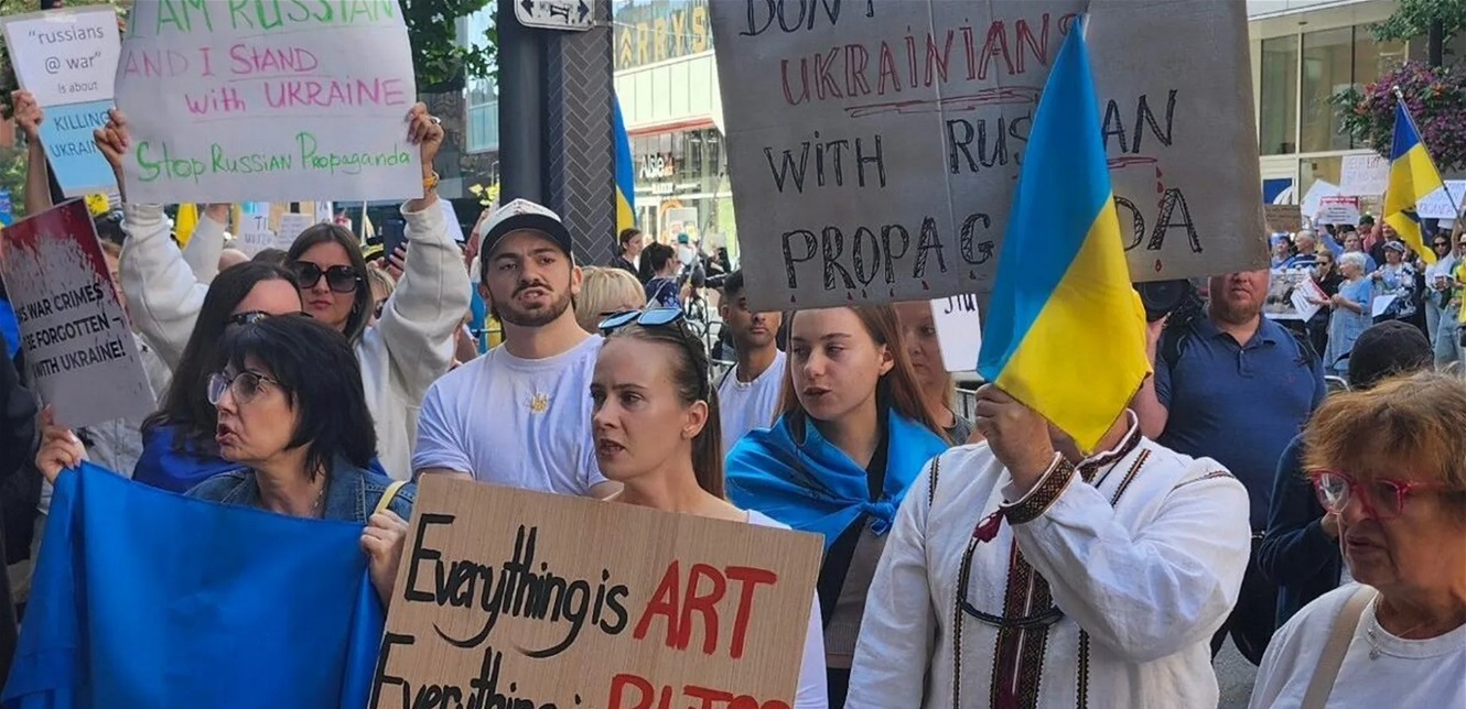 واصل كنديون من أصل أوكراني احتجاجاتهم على هامش مهرجان تورونتو السينمائي الدولي، حتى بعد قرار منظمي المهرجان وقف عرض فيلم وثائقي عن الجنود الروس في أوكرانيا والذي تعرض لانتقادات باعتباره دعاية.
