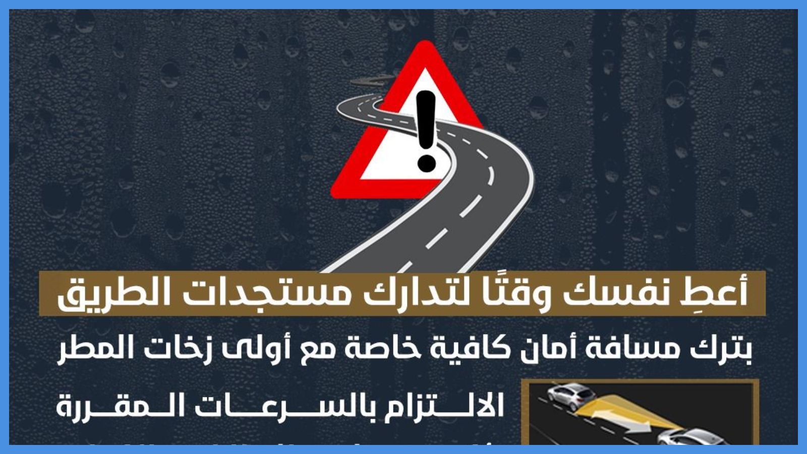 وأكدت المديرية على ضرورة القيادة بتأنٍ وحذر وترك مسافة أمان كافية بين المركبات، خاصة مع أولى زخات المطر التي عادة ما تتسبب بانزلاقات، بسبب اختلاط مياه الأمطار مع الأتربة ومخلفات المركبات على الطرقات، لافتة إلى ضرورة التأكد من سلامة الإطارات والكوابح تفادياً لوقوع الحوادث المرورية.