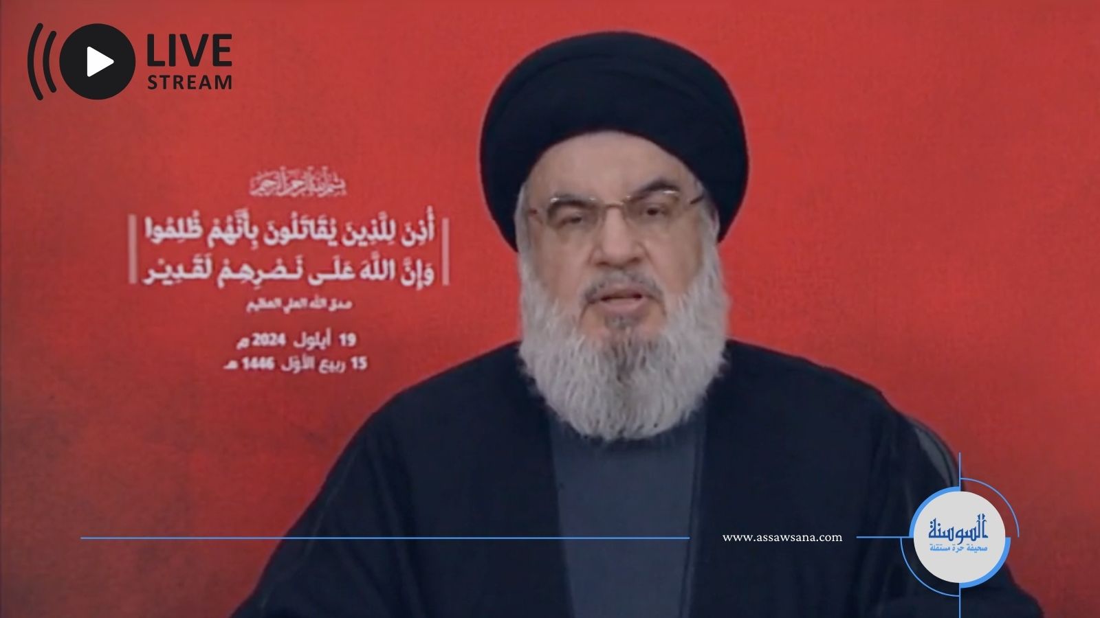 ألقى الأمين العام لحزب الله اللبناني، حسن نصر الله، كلمة تناول فيها التطورات الأخيرة، مشيرًا إلى الأحداث التي وقعت خلال اليومين الماضيين، وأعرب عن شكره للحكومة اللبنانية ووزارة الصحة والدفاع المدني على جهودهم الكبيرة في التعامل مع الإصابات، وخاصة تلك المتعلقة بالعيون، معتبرًا أن المستشفيات تواجه ضغطًا كبيرًا نتيجة الأعداد المرتفعة، وقال نصرالله، إنّ حزب الله تلقى ضربة كبيرة وقاسية، وهذا حال الحرب، والمهم أن لا تسقطنا الضربة، وقال: "هذه الضربة الكبيرة والقوية لن تسقطنا إن شاء الله، وسنصبح أقوى وأمتن وأشد صلابةً وقدرة على مواجهة كل الاحتمالات"