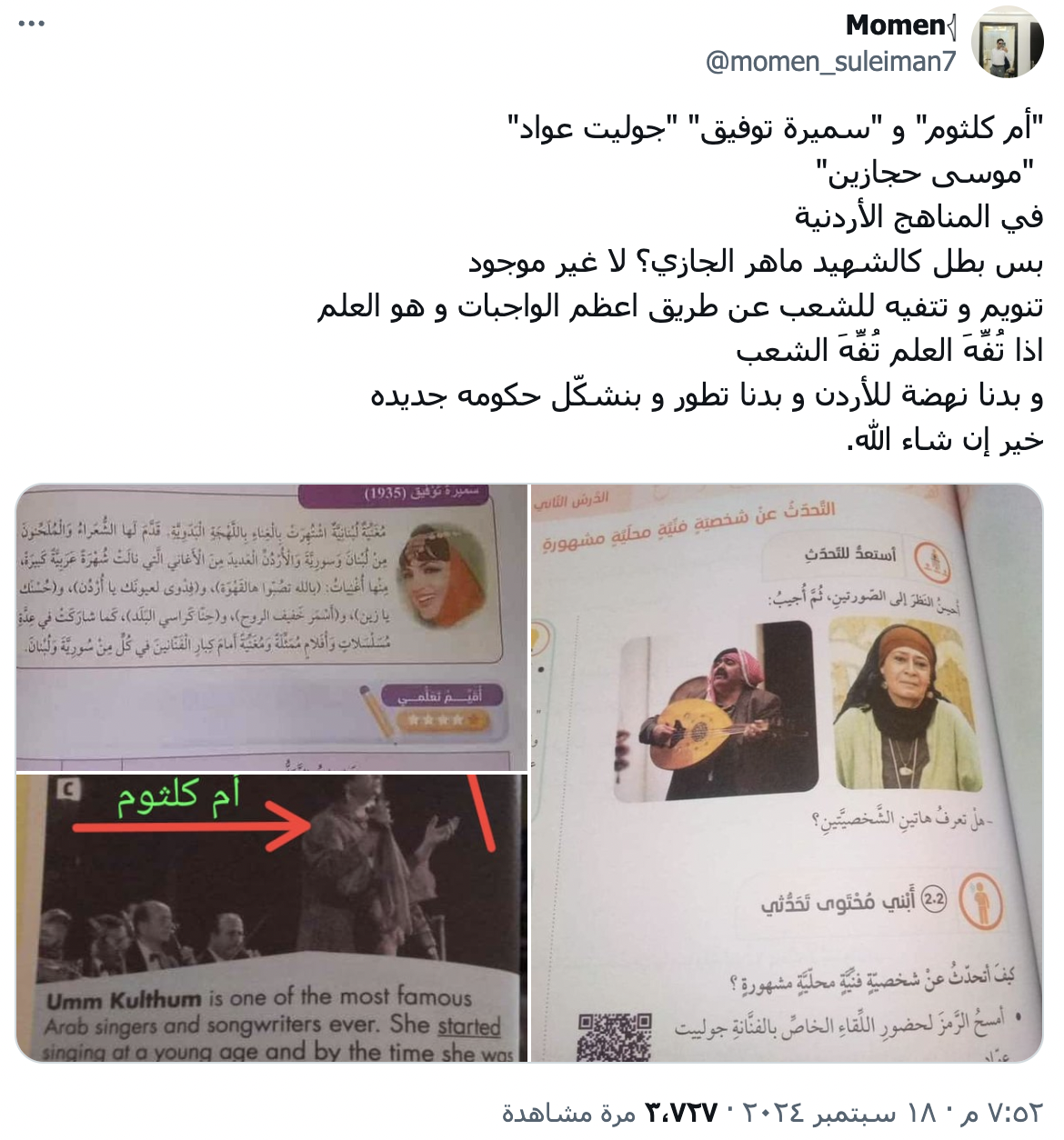 ضجّت مواقع التواصل الاجتماعيّ في الأردن بالجدل والحديث بعد انتشار صورة من كتاب التربية الموسيقيّة للصف الرابع الابتدائي، يظهر فيها تعريفٌ عن المطربة اللبنانية الشّهيرة سميرة توفيق.