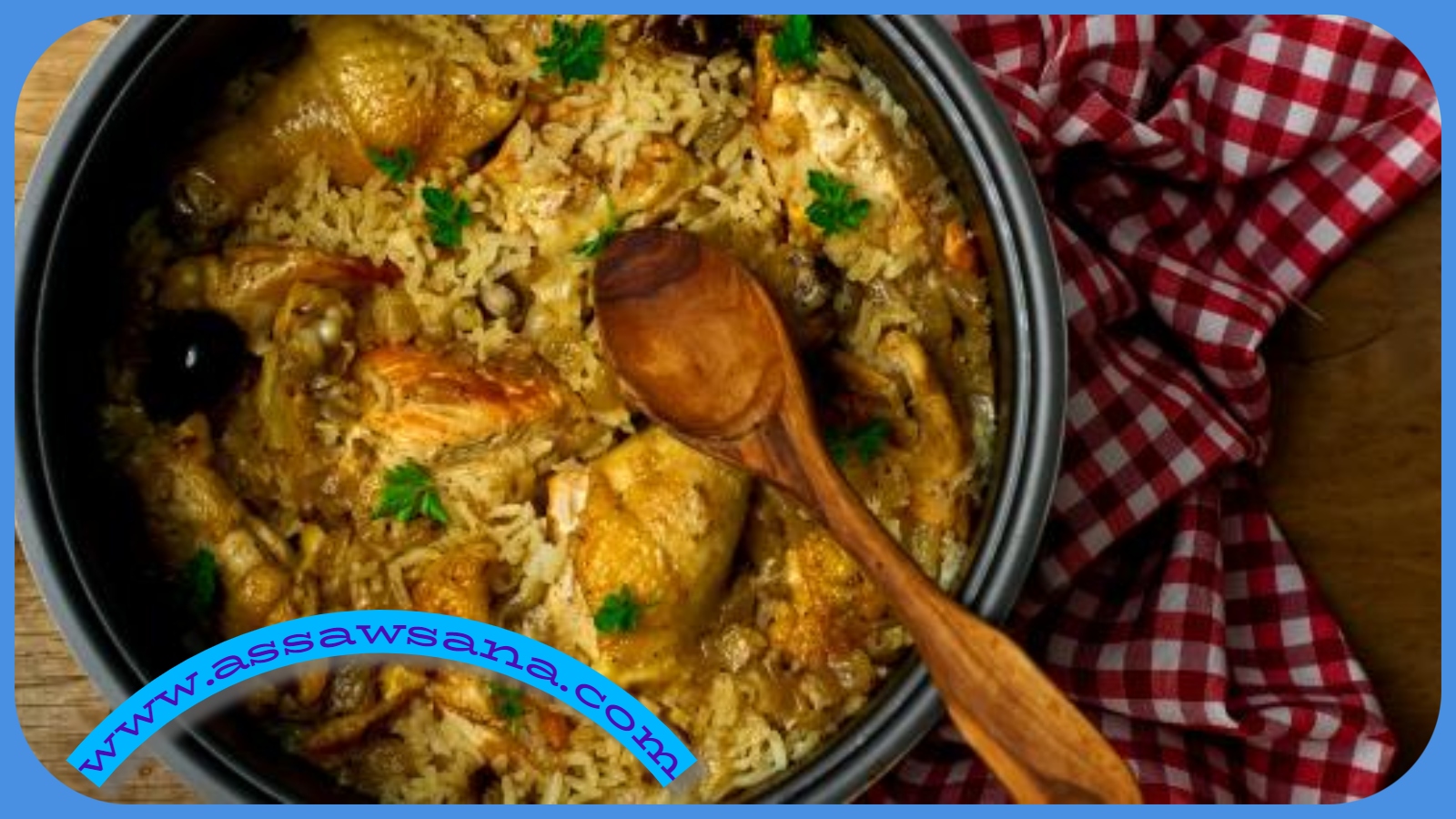 7. توزيع الزعفران على سطح الأرز وإضافة الحشوة والدجاج على السطح.