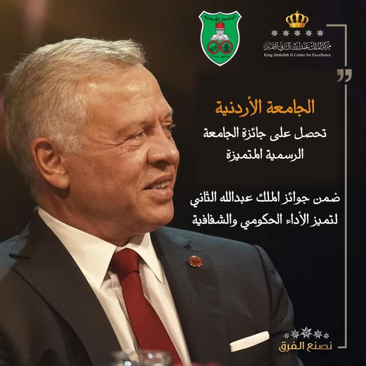سلّم جلالة الملك عبد الله الثاني، بحضور ولي العهد، سمو الأمير الحسين، وسمو الأمير فيصل، رئيس مجلس أمناء مركز الملك عبدالله الثاني للتميز، جائزة الجامعة الرسمية المتميزة لرئيس الجامعة الأردنية الدكتور نذير عبيدات، في حفل مهيب أقيم في قصر الثقافة لإعلان الفائزين بالدورة الحالية 2024، لجوائز الملك عبدالله الثاني لتميز الأداء الحكومي والشفافية.