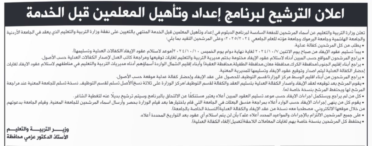 أعلنت وزارة التربية والتعليم، الثلاثاء، أسماء المرشحين من الدفعة السادسة لبرنامج الدبلوم المهني في إعداد وتأهيل المعلمين قبل الخدمة والمنتهية بالتعيين وعلى نفقة الوزارة الذي يعقد في الجامعة الأردنية والجامعة الهاشمية وجامعة اليرموك وجامعة مؤتة للعام الدراسي 2024/ 2025.