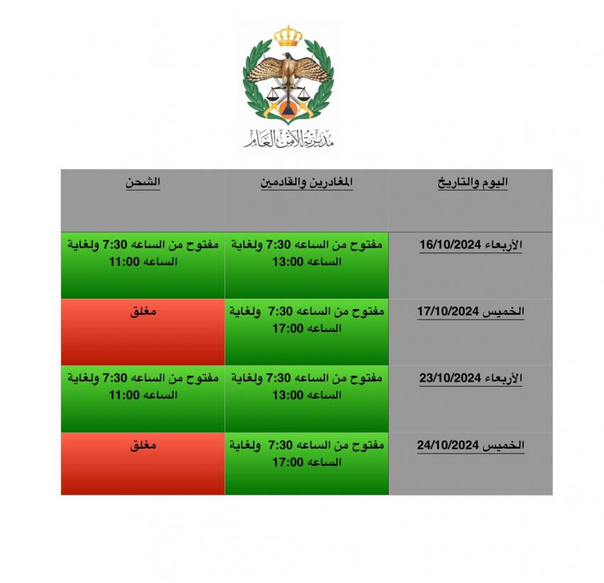أعلنت ادارة أمن الجسور التابعة لمديرية الأمن العام تعديل اوقات عمل جسر الملك حسين خلال شهر تشرين الأول الحالي.