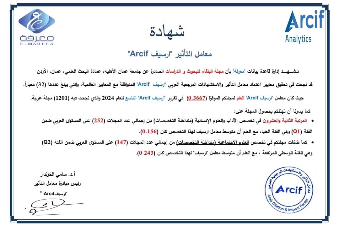 السوسنة - حققت مجلة البلقاء للبحوث والدراسات الصادرة عن عمادة البحث العلمي في جامعة عمان الأهلية إنجازاً أكاديمياً مرموقاً ،حيث حصلت على معامل التأثير "أرسيف" لعام 2024 ، وصنفت ضمن الفئة الأولى (Q1) بتخصصات الآداب والعلوم الإنسانية على المستوى العربي ، وذلك ضمن التقرير السنوي التاسع الصادر عن قاعدة بيانات "معرفة". الامر الذي يعكس التزام المجلة بالمعايير الأكاديمية الرفيعة وسعيها المستمر نحو تعزيز جودة البحث العلمي.
