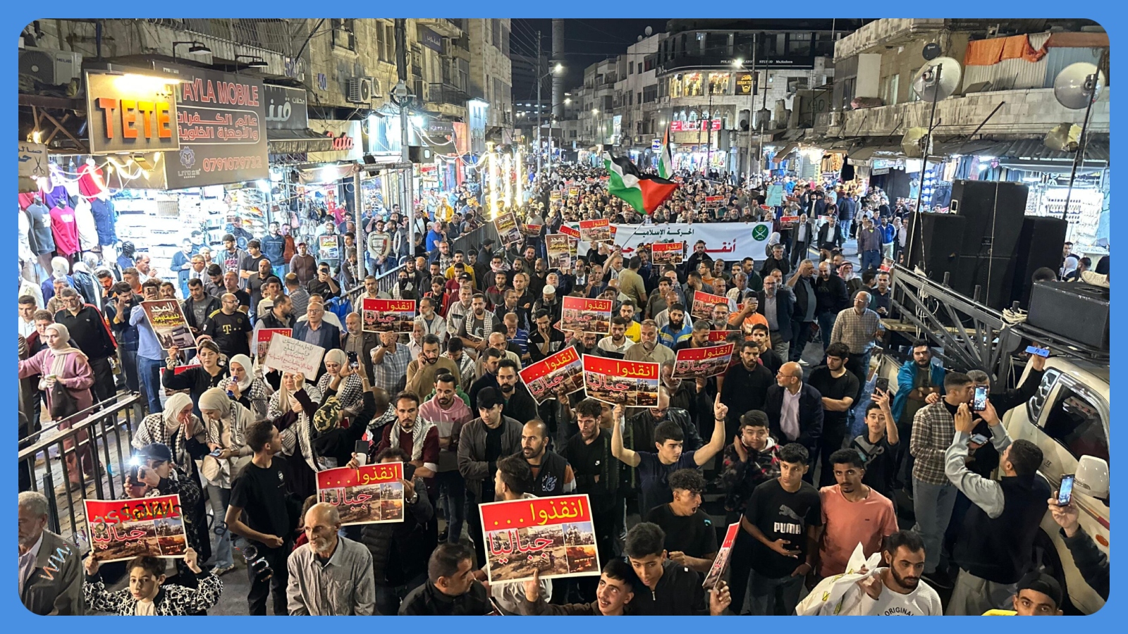 انطلقت مساء الثلاثاء حشود كبيرة من الأردنيين في طوفان بشري حاشد من المسجد الحسيني بوسط عمان، بدعوة من الحركة الإسلامية تحت شعار "أنقذوا جباليا"، حيث هتف المشاركون نصرةً لجباليا ورفعوا لافتات تدعو لإنقاذها ووقف المجازر الوحشية بحق المدنيين.
