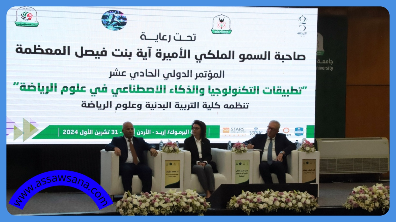 رعت سمو الأميرة آية بنت فيصل، افتتاح فعاليات المؤتمر الدولي الحادي عشر، الذي تنظمه كلية التربية البدنية وعلوم الرياضة في جامعة اليرموك بعنوان "تطبيقات التكنولوجيا والذكاء الاصطناعي في علوم الرياضة"، على مدار ثلاثة أيام.