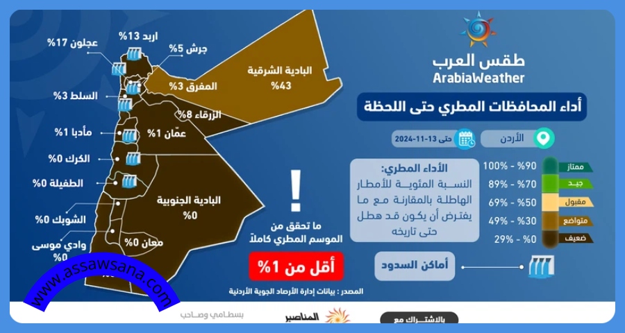 أعلن مركز طقس العرب الإقليمي في تقرير صادر عنه أن أداء الموسم المطري حتى منتصف نوفمبر 2024 يعتبر ضعيفاً للغاية، حيث لم يتحقق حتى الآن سوى أقل من 1% من المعدل الموسمي للأمطار. وبحسب التقرير، يشهد الأردن شحاً مطرياً في مختلف مناطقه، فيما لم تتعرض المناطق الجنوبية، مثل العقبة ومعان والطفيلة والكرك، لأي هطولات منذ بداية الموسم.