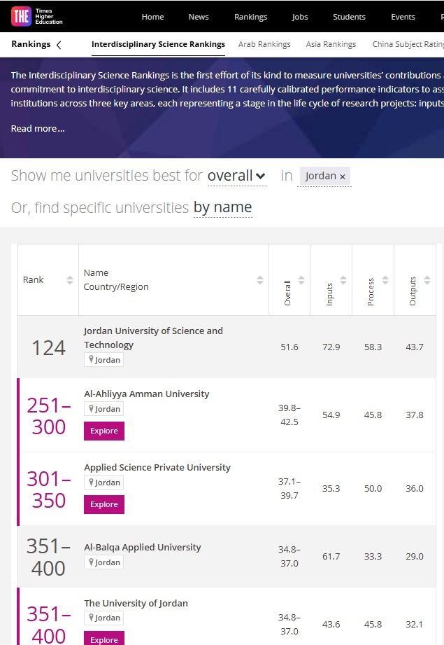 واصلت جامعة عمان الأهلية تعزيز مكانتها الأكاديمية والبحثية على المستويين المحلي والدولي، محققةً إنجازاً متميزاً بتصدرها قائمة الجامعات الخاصة في الأردن واحتلالها المركز الثاني محلياً على الجامعات الاردنية الرسمية والخاصة ضمن تصنيف التايمز لجودة البحوث العلمية متعددة التخصصات لعام 2025 (Times Higher Education Interdisciplinary Science Rankings 2025).