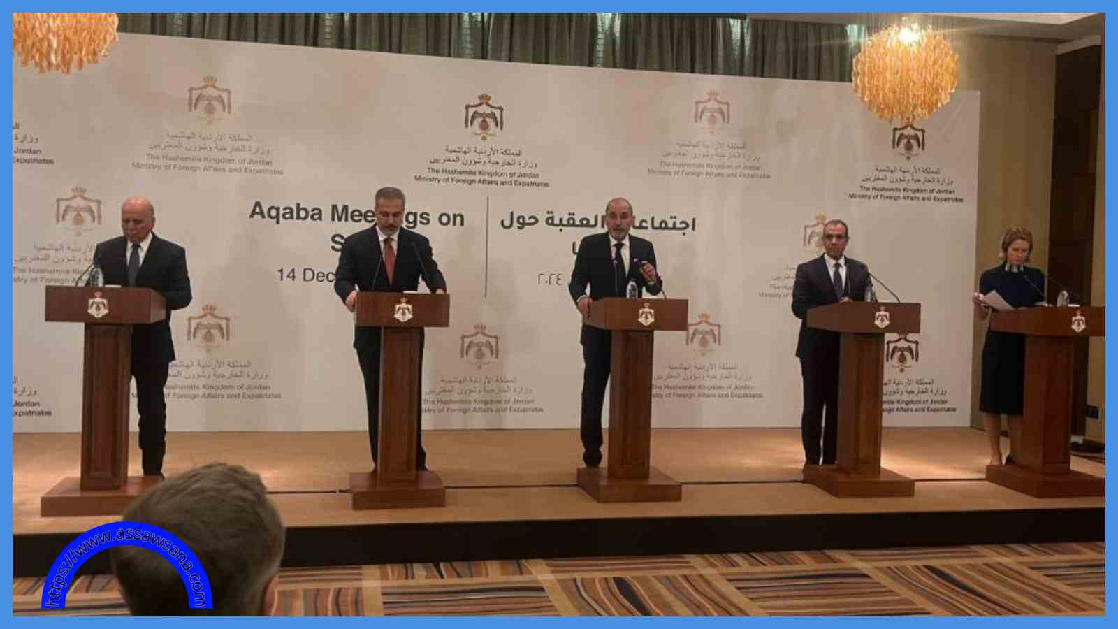 في ختام أعمال اجتماعات العقبة حول سوريا، عقد نائب رئيس الوزراء وزير الخارجية وشؤون المغتربين أيمن الصفدي، مؤتمرا صحفيا مشتركا مع وزير الخارجية التركي هاكان فيدان، ووزير الخارجية والهجرة وشؤون المصريين بالخارج بدر عبدالعاطي، ووزير خارجية جمهورية العراق فؤاد حسين.