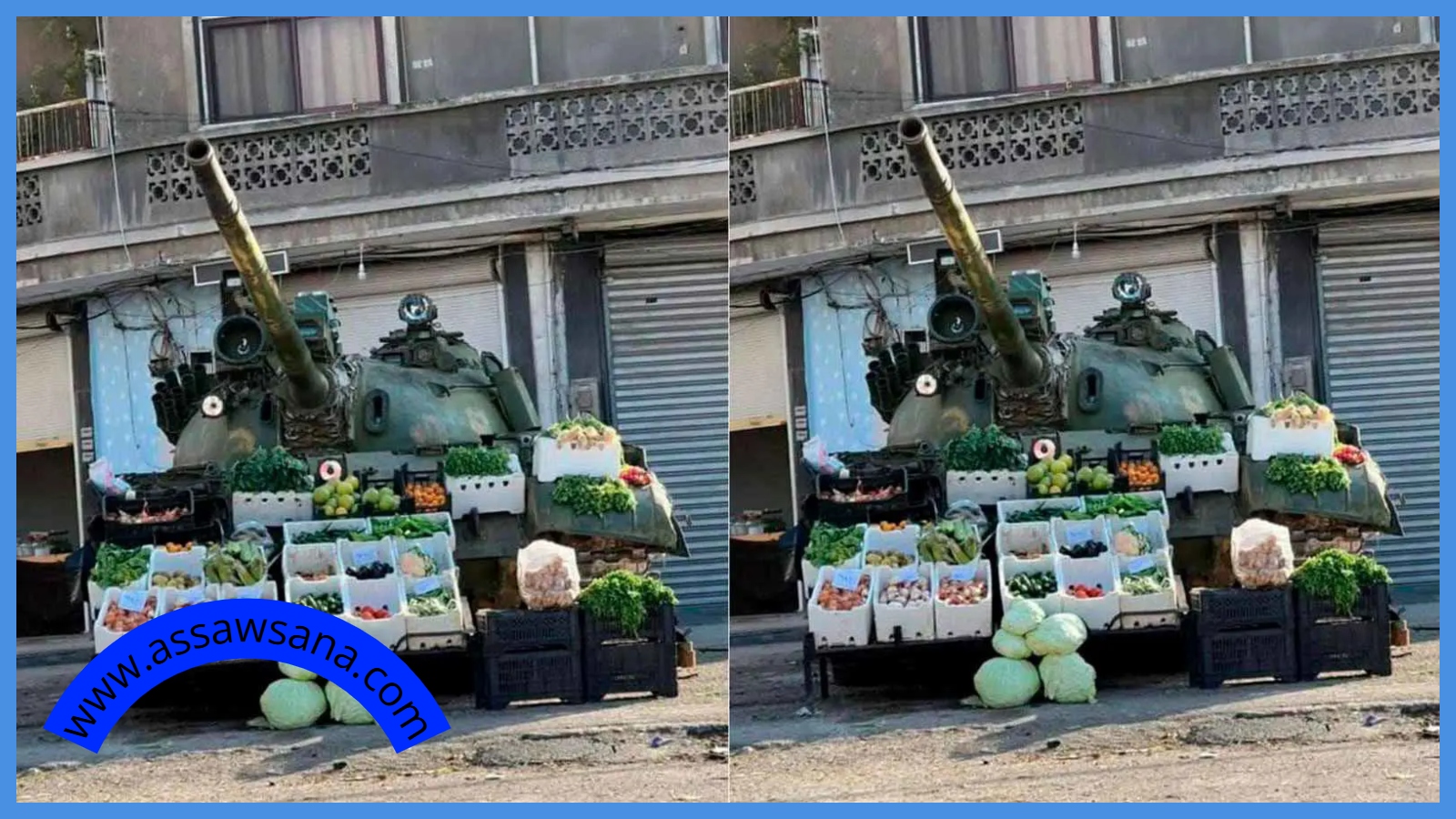ظهرت في الصورة، التي حظيت بتداول واسع، دبابة مركونة على جانب إحدى الطرق، وقد تم وضع صناديق مليئة بالخضراوات والفواكه بشكل جذاب للبيع.