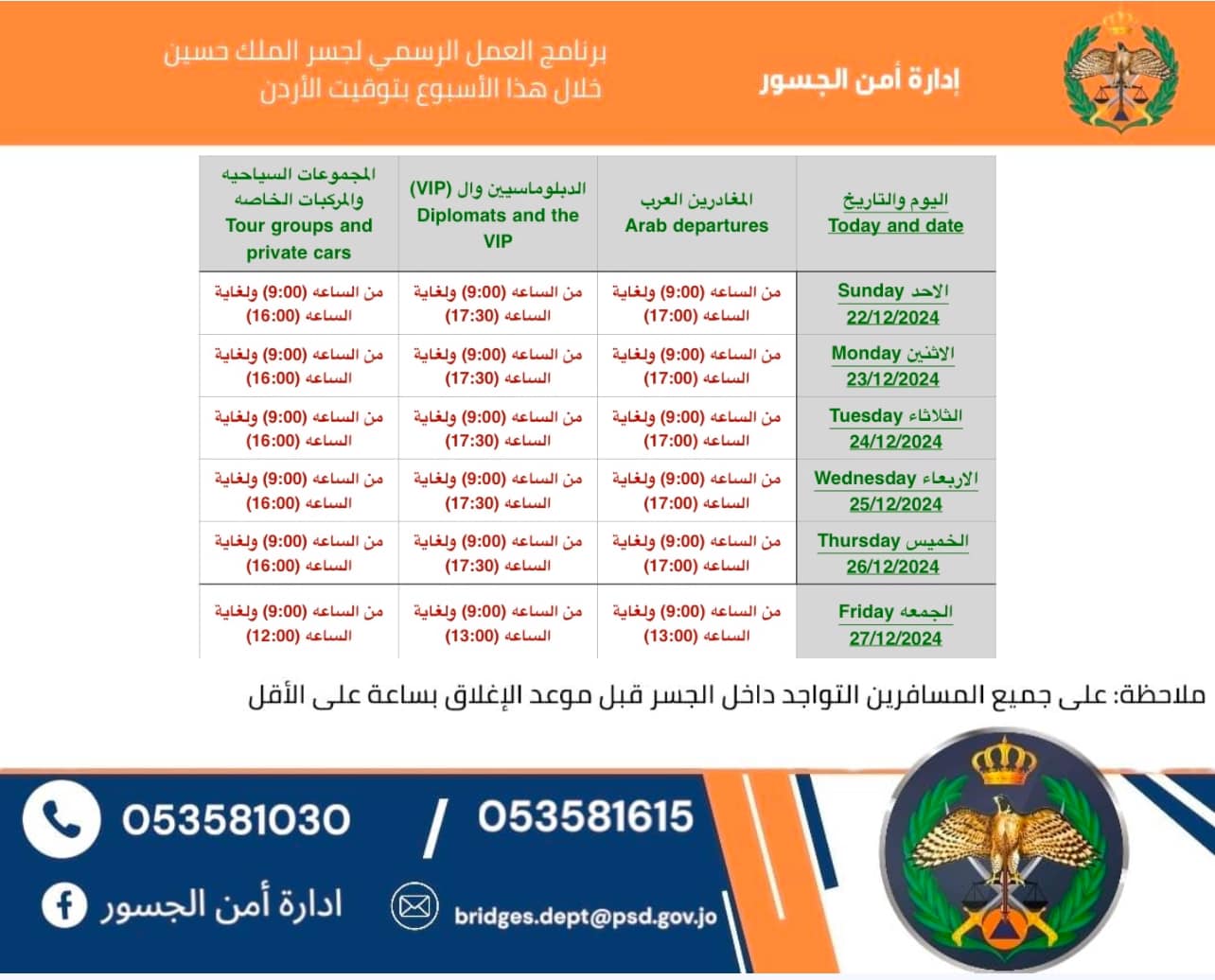 أعلنت إدارة أمن الجسور في مديرية الأمن العام، برنامج عمل جسر الملك حسين خلال هذا الاسبوع وكما هو موضح بالجدول أدناه.