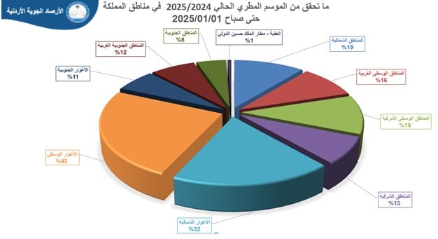 القطاع الدائري أدناه يبين ما تحقق منذ بداية الموسم المطري وحتى صباح 01 /01 /2025.