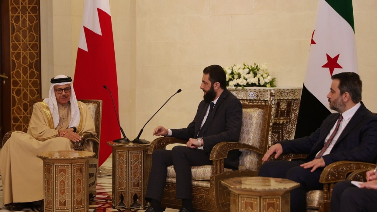استقبل قائد الإدارة السورية المؤقتة أحمد الشرع وزير خارجية البحرين عبد اللطيف بن راشد الزياني والوفد المرافق له في قصر الشعب بالعاصمة دمشق.