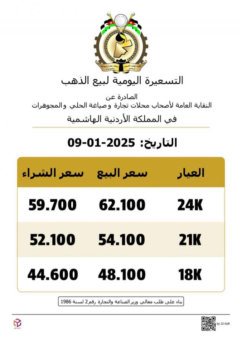 وكما بلغ سعر الغرام الواحد من الذهب عياري 24 و18 لغايات البيع من محلات الصاغة عند 62,1 و48,1 دينارا على التوالي.