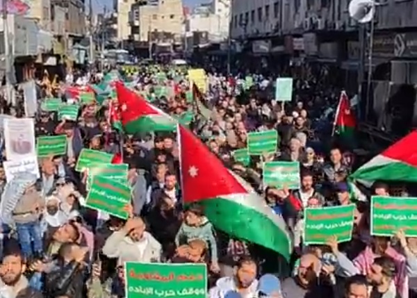 انطلقت بعد صلاة ظهر الجمعة من أمام المسجد الحسيني بمنطقة وسط البلد، مسيرة حاشدة بشاركة آلاف الأردنيين تحت شعار "دعم المقاومة ووقف حرب الإبادة واجب عربي إسلامي".
