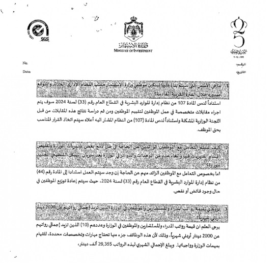 وبين أنّ الوزارة ستتعامل مع الموظفين الزائد عددهم عن الحاجة إن وجد وفق المادة 44 من نظام الموارد البشرية في القطاع العام رقم 33 سنة 2024 حيث سيتم توزيع الموظفين في حال وجود فائض أو نقص .