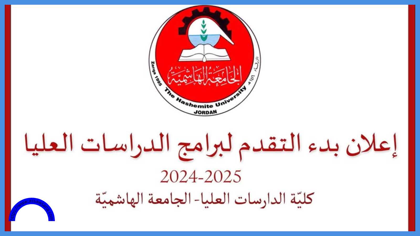 أعلنت كلية الدراسات العليا في الجامعة الهاشمية عن بدء تقديم طلبات الالتحاق في برامج الدراسات العليا: الماجستير والدبلوم العالي للبرنامجين العادي والدولي للفصل الدراسي الثاني 2024/2025 بدْءًا من الخميس 23-1-2025 ولغاية الأحد 2-2-2025.