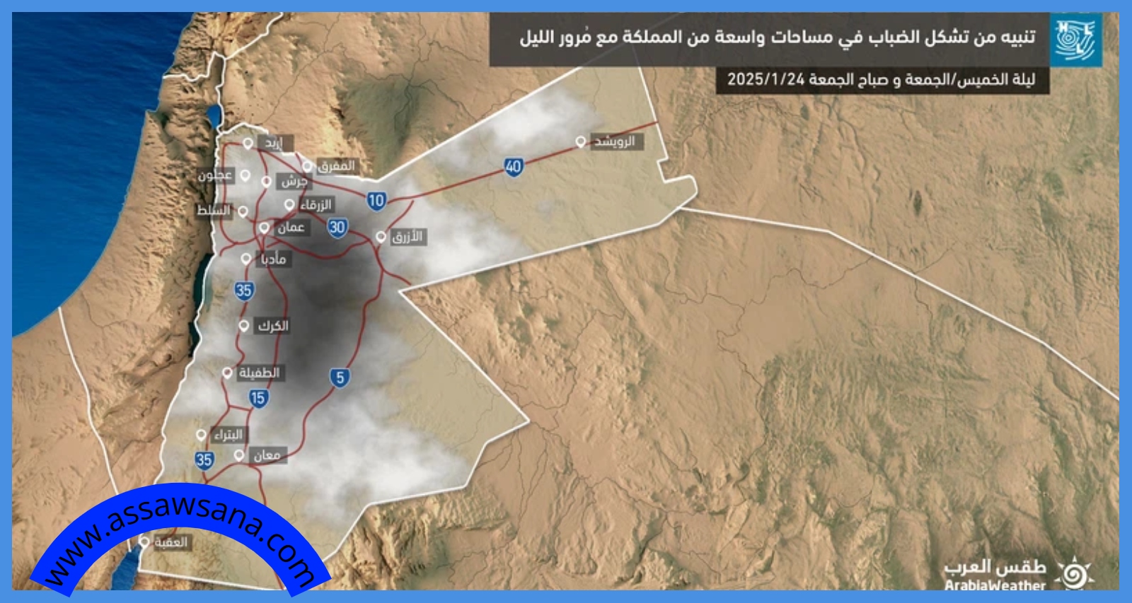 خلال ساعات الليل، يستقر الطقس تدريجياً، مع احتمالية تجدد تشكل الضباب في السهول الشرقية والطريق الصحراوي، كما يحتمل تشكل الصقيع فوق قمم جبال الشراه.