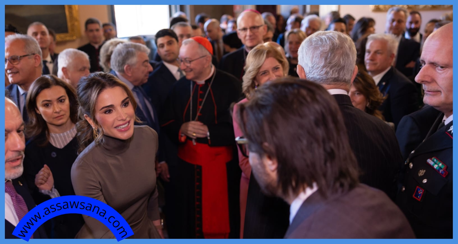 وكان في استقبال جلالتها وسيدة إيطاليا الأولى لدى وصولهما المعرض الذي يحتفل بمرور ثلاثين عاماً على العلاقات الدبلوماسية بين الأردن والفاتيكان، أمين سر دولة حاضرة الفاتيكان الكاردينال بيترو بارولين والمستشار الأكبر لمنظمة فرسان مالطا ريكاردو باتيرنو دي مونتيكوبو ورئيس إدارة التراث في الكرسي الرسولي المونسنيور جيوردانو بيتشينوتي والسفير الأردني في إيطاليا قيس أبو دية والسفيرة الأردنية لدى الجمهورية الفرنسية والكرسي الرسولي لينا الحديد .
