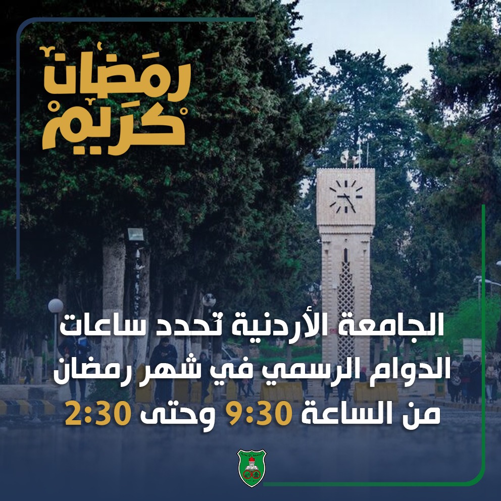 السوسنة - قرّر رئيسُ الجامعة الأردنية الدكتور نذير عبيدات، تحديدَ ساعات الدوام الرسميّ للعاملين في الجامعة، خلال شهر رمضان المبارك، ليصبحَ من الساعة التاسعة والنصف صباحًا، وحتّى الثانية والنصف بعد الظهر.