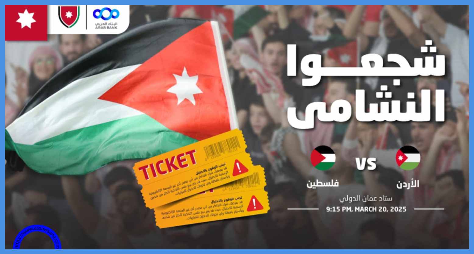 أكد اتحاد كرة القدم انه لن يُسمح بدخول أي شخص مهما كان عمره، لا يحمل تذكرة مباراة المنتخب الوطني أمام نظيره الفلسطيني والتي ستقام عند 9:15 من مساء الخميس 20 آذار، على ستاد عمّان الدولي، ضمن الدور الثالث والحاسم من تصفيات كأس العالم 2026، وذلك حفاظاً على سلامة الجماهير.