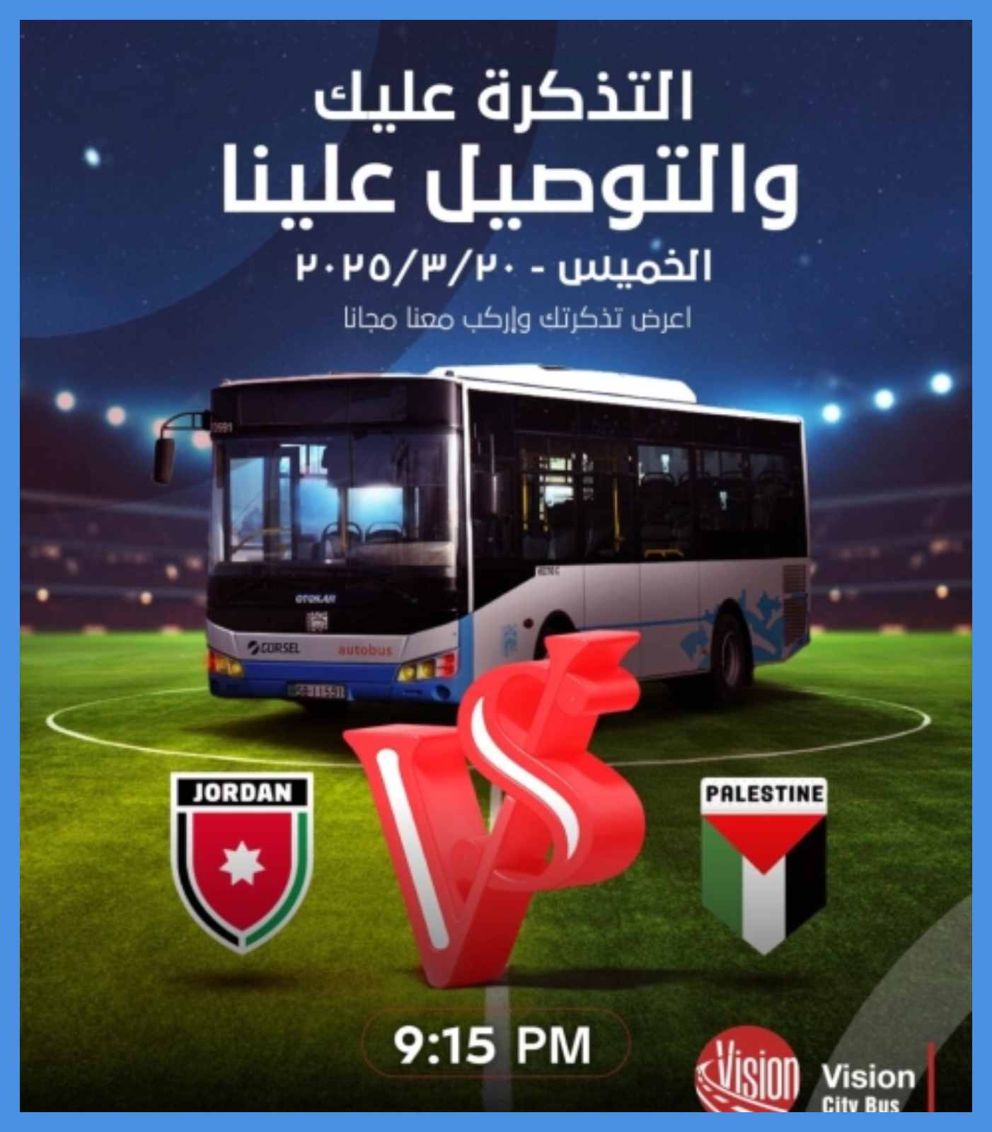 أعلنت شركة رؤية عمّان للنقل، عن تقديم خدمة النقل المجاني لحاملي تذاكر مباراة النشامى ضد نظيره الفلسطيني التي تصادف يوم غد الخميس عبر حافلات باص عمّان، و الباص سريع التردد.
