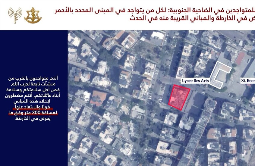 وأضاف: "أنتم تتواجدون بالقرب من منشآت تابعة لحزب الله من أجل سلامتكم وسلامة أبناء عائلاتكم أنتم مضطرون لإخلاء هذه المباني فوراً والابتعاد عنها المسافة لا تقل عن 300 متر وفق ما يُعرض في الخارطة".