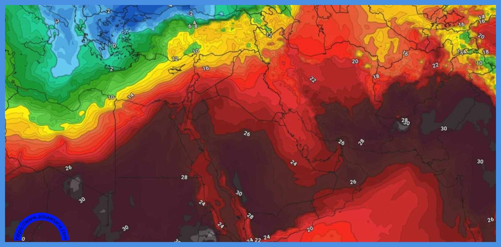 وتتحول الأجواء لتصبح حارة نسبياً في جميع مناطق المملكة، مع ظهور السحب المتوسطة والعالية، ويصبح الطقس حاراً بشكل واضح في الأغوار والبحر الميت والعقبة حيث تقترب درجات الحرارة من الـ 40 مئوية.