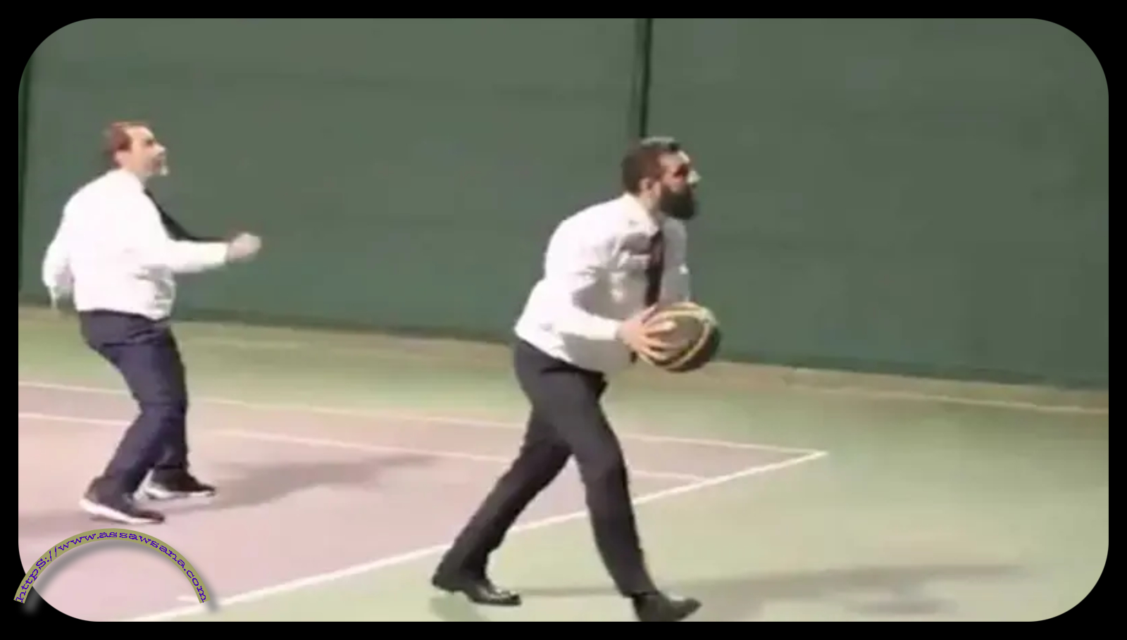 السوسنة- ظهر الرئيس السوري أحمد الشرع ووزير خارجيته أسعد الشيباني في فيديو وهما يمارسان لعبة كرة السلة وهما يرتديان الملابس الرسمية.