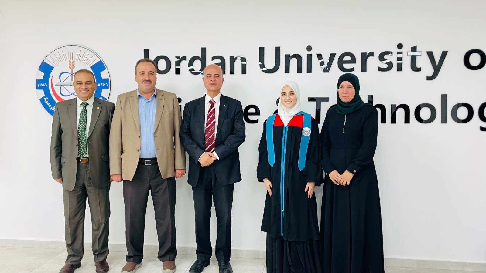 وتكونّت لجنة المناقشة من الأستاذ الدكتورة تمام عليمات من قسم الكيمياء الطبية والعقاقير في كلية الصيدلة مشرفا رئيسا والأستاذ الدكتور رامي الخطيب من قسم التقانات الحيوية في كلية العلوم في جامعة العلوم والتكنولوجيا الاردنية مشرفا مشاركا والأستاذ الدكتور عدنان المساعده من قسم الكيمياء الطبية والعقاقير في كلية الصيدلة في جامعة العلوم والتكنولوجيا الاردنية عضوا وممتحنا داخليا والاستاذ الدكتور محمود القضاة من قسم الكيمياء في جامعة اليرموك عضوا وممتحنا خارجيا.