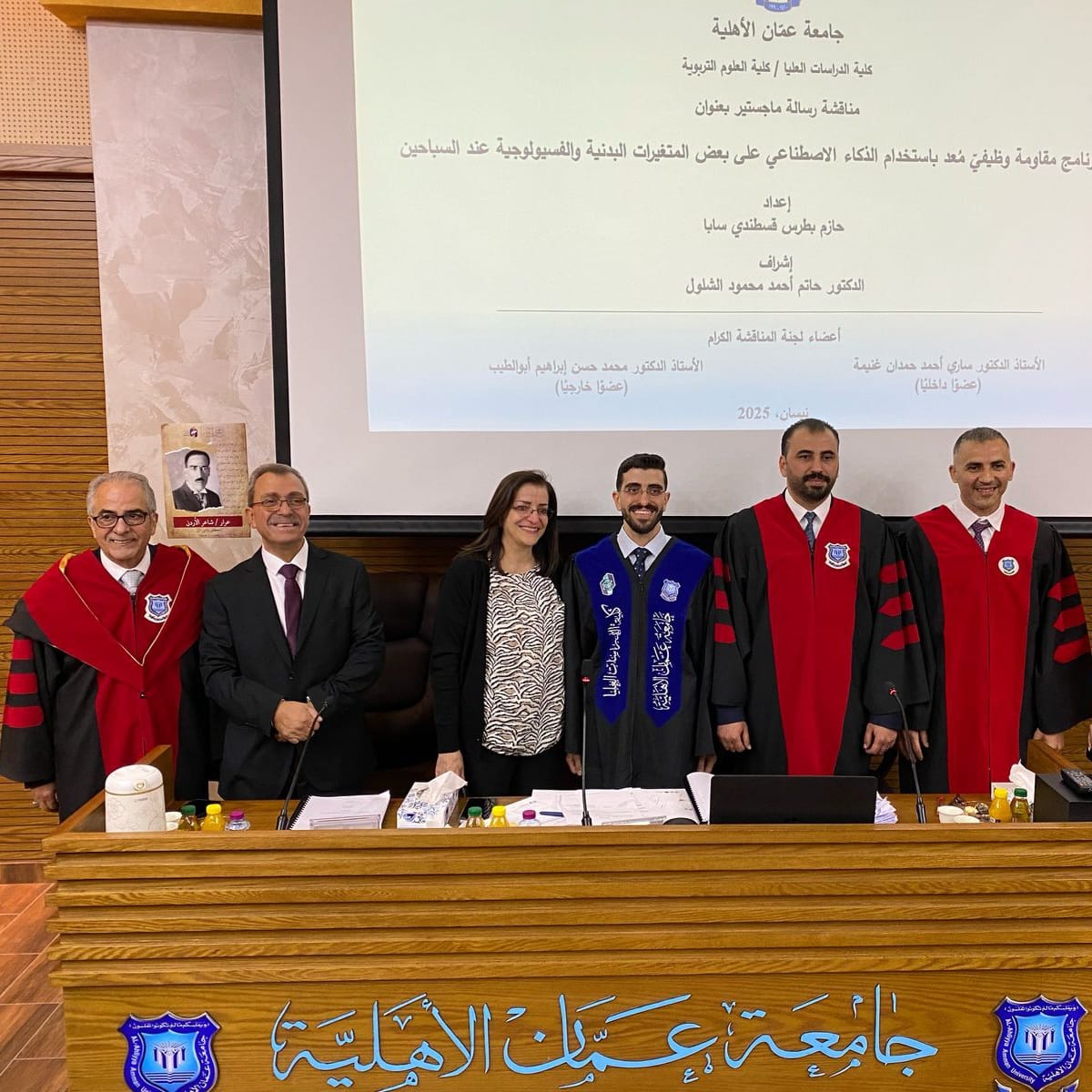 وتكونت لجنة المناقشة من رئيس جامعة عمان الأهلية الأستاذ الدكتور ساري حمدان مناقشاً داخليا، والأستاذ الدكتور محمد ابو الطيب من الجامعة الأردنية مناقشا خارجياً، وأشرف على الرسالة الدكتور حاتم الشلول رئيس قسم التربية البدنية والصحية في كلية العلوم التربوية مشرفا رئيسياً.