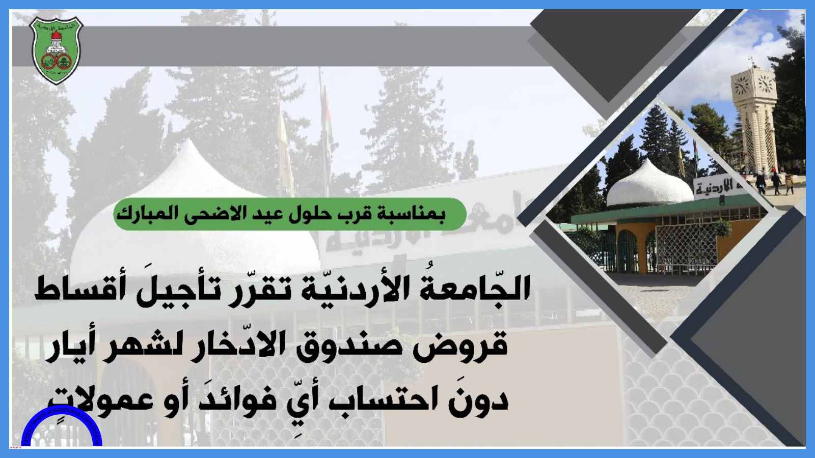 بمناسبةِ حلول عيد الأضحى المبارك، وللتخفيف عن الموظفين؛ بسبب الالتزامات والتجهيزات للعيد، قرّر رئيسُ الجامعة الأردنيّة الدكتور نذير عبيدات تأجيلَ أقساط جميع قروض صندوق الادّخار عن شهر أيار لهذا لعام 2025.