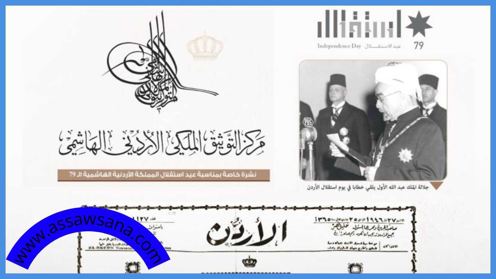 أصدر مركز التوثيق الملكي الأردني الهاشمي، الثلاثاء، نشرة توثيقية خاصة بمناسبة الذكرى التاسعة والسبعين لاستقلال المملكة الأردنية الهاشمية، تضمنت استعراضًا لأبرز المحطات التاريخية والأحداث الوطنية المرتبطة بهذا الحدث المفصلي في مسيرة الدولة.