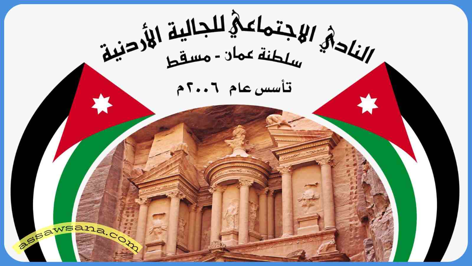 مسقط – السوسنة - رفع نادي الجالية الأردنية في سلطنة عُمان، ممثلًا برئيس مجلس الإدارة السيد عمار علي عبيدات وأعضاء مجلس الإدارة والجمعية العمومية، أسمى آيات التهاني والتبريكات إلى حضرة صاحب الجلالة الملك عبدالله الثاني ابن الحسين، وسمو ولي عهده الأمين الأمير الحسين بن عبدالله الثاني، بمناسبة عيد الاستقلال التاسع والسبعين للمملكة الأردنية الهاشمية.