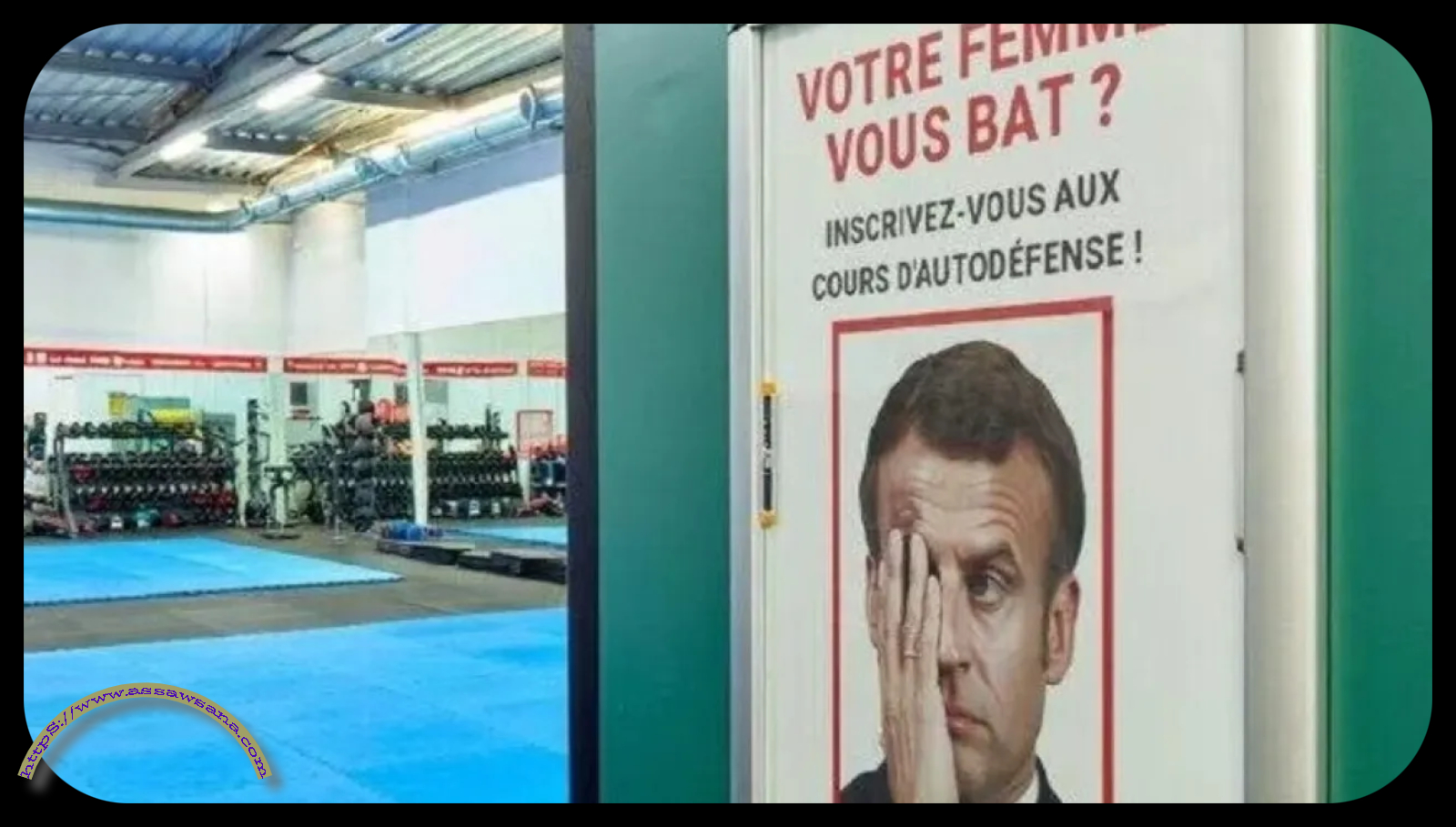 ويظهر في الإعلان الذي يبدو أنه التُقط داخل صالة ألعاب رياضية بفرنسا، صورة ساخرة لماكرون وقد غُطيت إحدى عينيه وبدا على وجهه كدمة، مع عبارة تقول: "هل تتعرض للضرب من زوجتك؟ سجّل الآن في دورات الدفاع عن النفس! للمزيد من المعلومات، تواصل مع الإدارة".