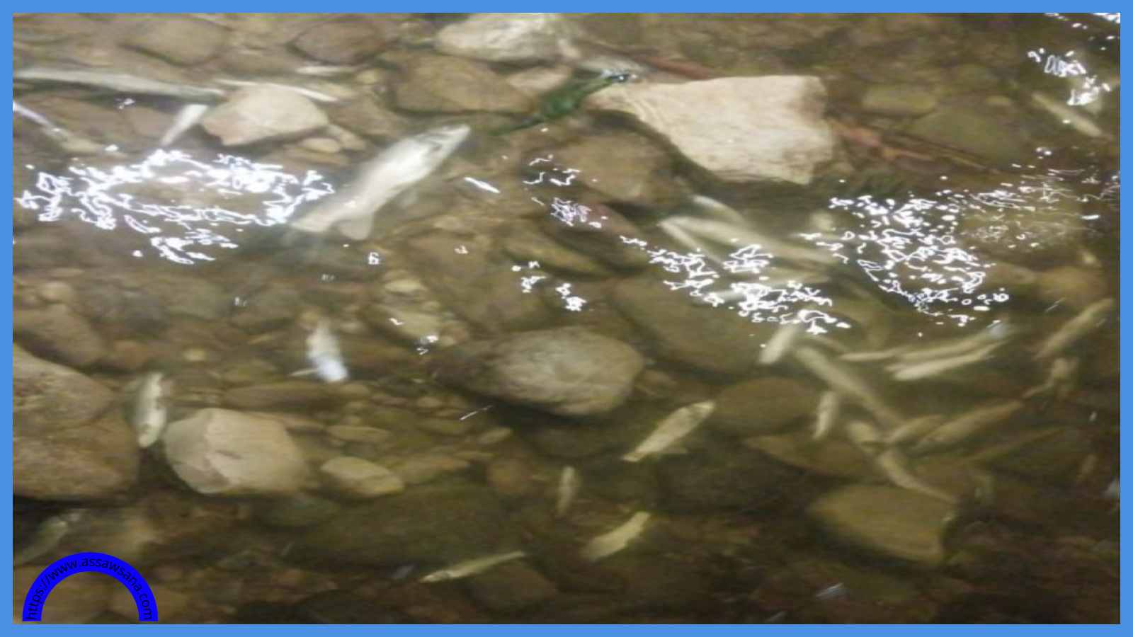 وشوهدت أعداد كبيرة من الأسماك النافقة على ضفاف السيل.
