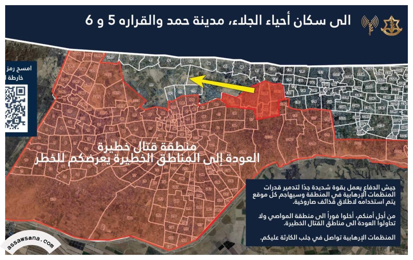السوسنة - وجه الجيش الإسرائيلي مساء الثلاثاء إنذارا عاجلا لسكان أحياء الجلاء ومدينة حمد والمنطقتين 5 و6 في القرارة بقطاع غزة، داعيا إلى الإخلاء الفوري نحو منطقة المواصي وعدم العودة إلى ما وصفها بـ"مناطق القتال الخطيرة".