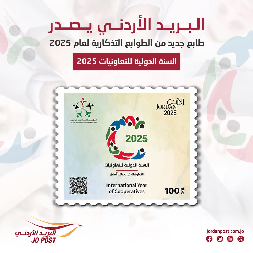 أعلن البريد الأردني عن طرح إصدار جديد من الطوابع التذكارية لعام 2025 بعنوان "السنة الدولية للتعاونيات 2025" للبيع للجمهور ولهواة الطوابع، اعتبارا من اليوم الأحد.