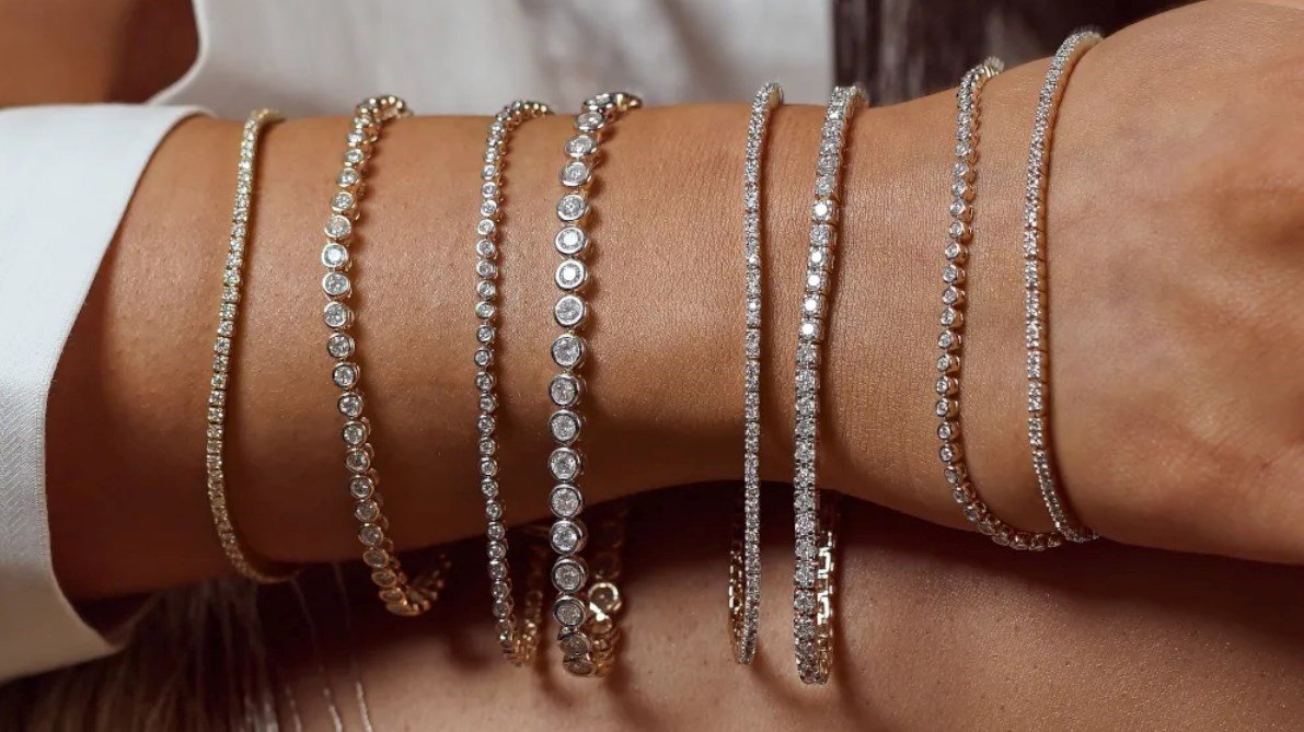 وتتميّز أساور التنس بتصميمها الرقيق والمرن، إذ تُرصّف أحجار الألماس متساوية الحجم على سوار غالباً ما يُصاغ من الذهب الأبيض، ما يمنحها مظهراً شفافاً وكأنها تطوّق المعصم دون إطار مرئي، حتى باتت تُعرف تاريخياً بـ"سوار الحب الأبدي".