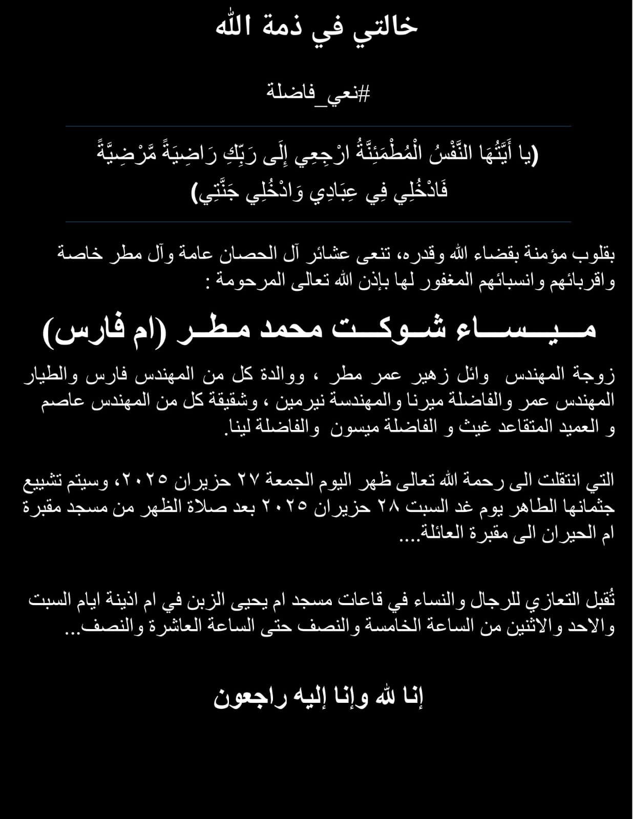 بقلوب مؤمنة بقضاء الله وقدره، تنعى عشائر آل الحصان عامة وآل مطر خاصة وأقرباؤهم وأنسباؤهم المغفور لها بإذن الله تعالى المرحومة: