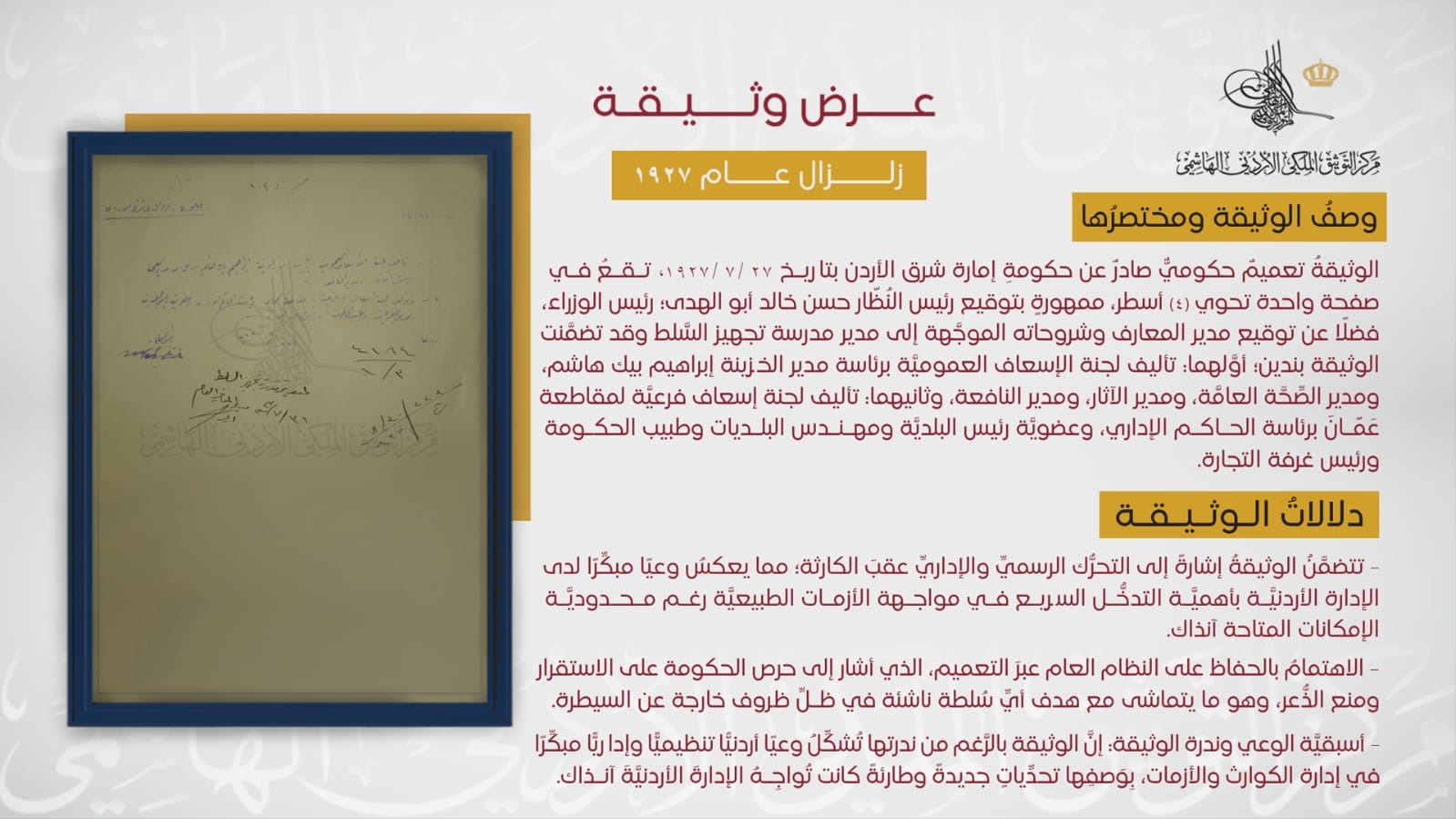التوثيق الملكي يعرض وثيقة حول زلزال نابلس
