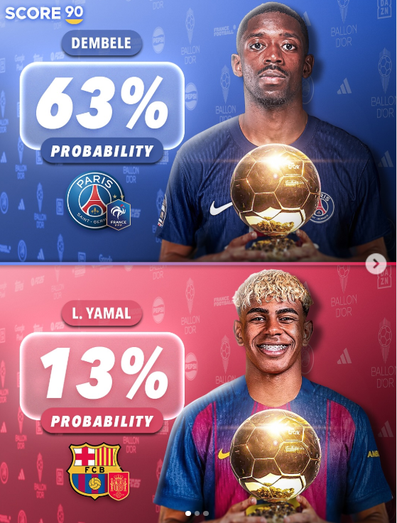 وحسب الذكاء الاصطناعي فان عثمان ديمبلي هو المرشح الأقوى حيث لديه حظوظا نسبتها 63 % مقابل 13% للنجم الإسباني الصاعد.