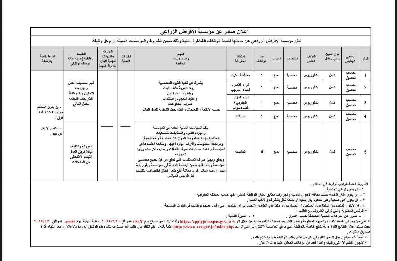 مؤسسة الإقراض الزراعي تعلن وظائف محاسبة شاغرة