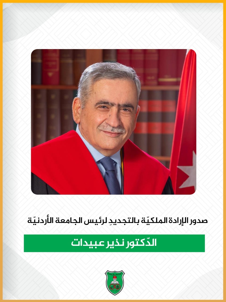 السوسنة - صدرت مساء اليوم الأربعاء الإرادة الملكيّة السّامية بتجديد تعيين الأستاذ الدّكتور نذير مفلح محمّد عبيدات رئيسًا للجامعةِ الأردنيّة لمدّة أربع سنوات، في قرارٍ يُجسّد الثقة الراسخة بالكفاءات الوطنية والقيادات التي أثبتت جدارتها في إحداثِ التغيير.