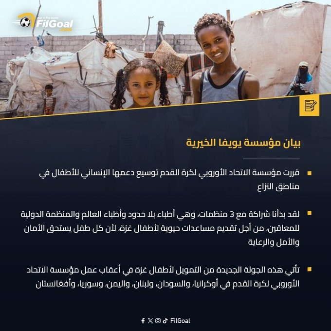 وأضاف أن مؤسسة الاتحاد الأوروبي لكرة القدم للأطفال تسعى لدعم العاملين على تخفيف الأعباء عن الأطفال، ومنحهم لحظات من السلام والأمل حتى في أصعب الظروف.