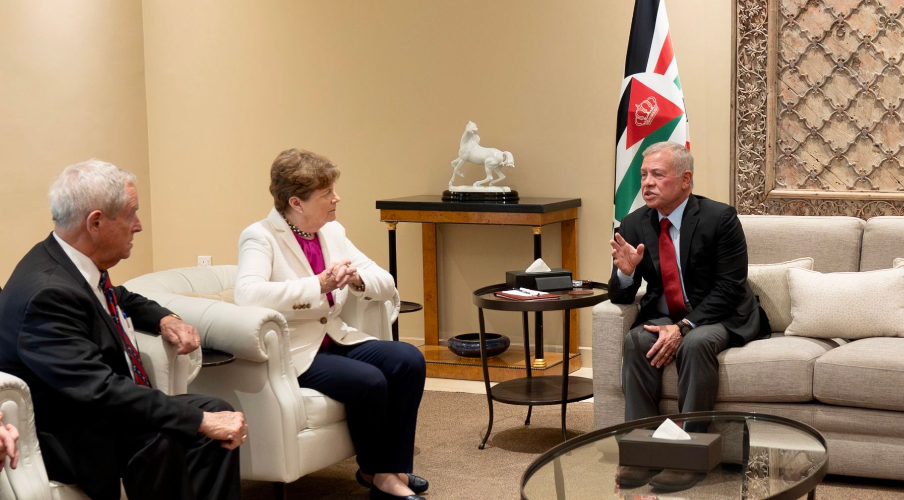 السوسنة - استقبل جلالة الملك عبدالله الثاني، اليوم الأحد، عضو مجلس الشيوخ الأمريكي السيناتور جين شاهين، وعضو مجلس النواب الأمريكي جو ويلسون، في لقاء ركز على الشراكة الاستراتيجية بين الأردن والولايات المتحدة، وجهود البلدين المشتركة لتحقيق السلام والاستقرار في منطقة الشرق الأوسط.