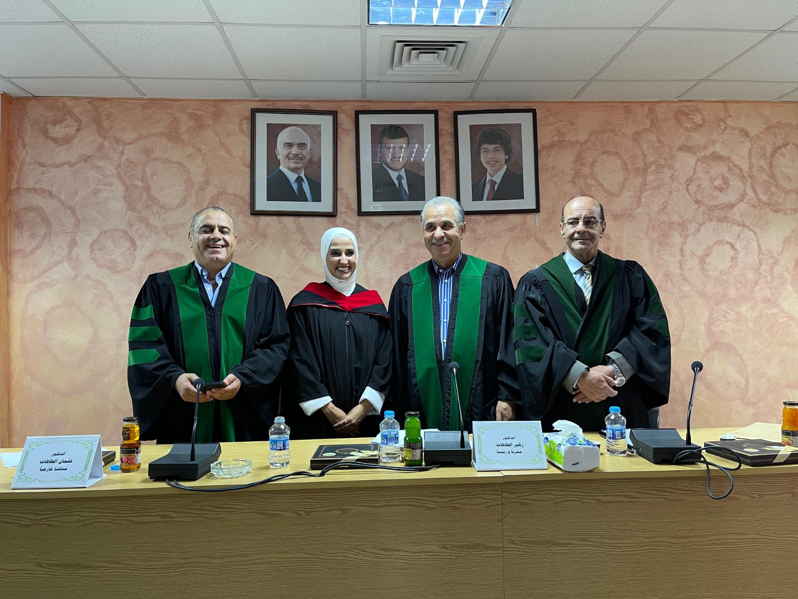 موجهين الشكر إلى لجنة المناقشة ممثلة بالدكتور زهير الطاهات "مشرفا ورئيسا"، والدكتور حاتم علاونة" مشرفا داخليًا"، والدكتور عثمان الطاهات " مشرفا خارجيًا".