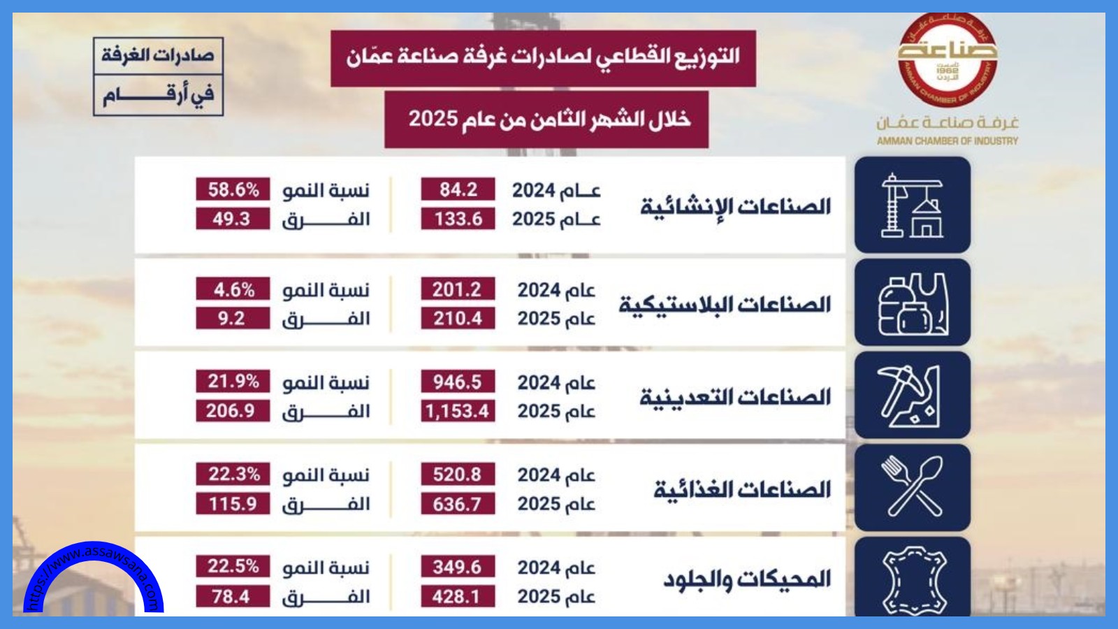 وأظهرت المعطيات الإحصائية، ارتفاع صادرات صناعة عمان إلى سوريا، خلال الفترة ذاتها بنسبة 412 بالمئة، حيث وصلت إلى 227 مليون دينار مقابل 44 مليون دينار لنفس الفترة من العام الماضي.